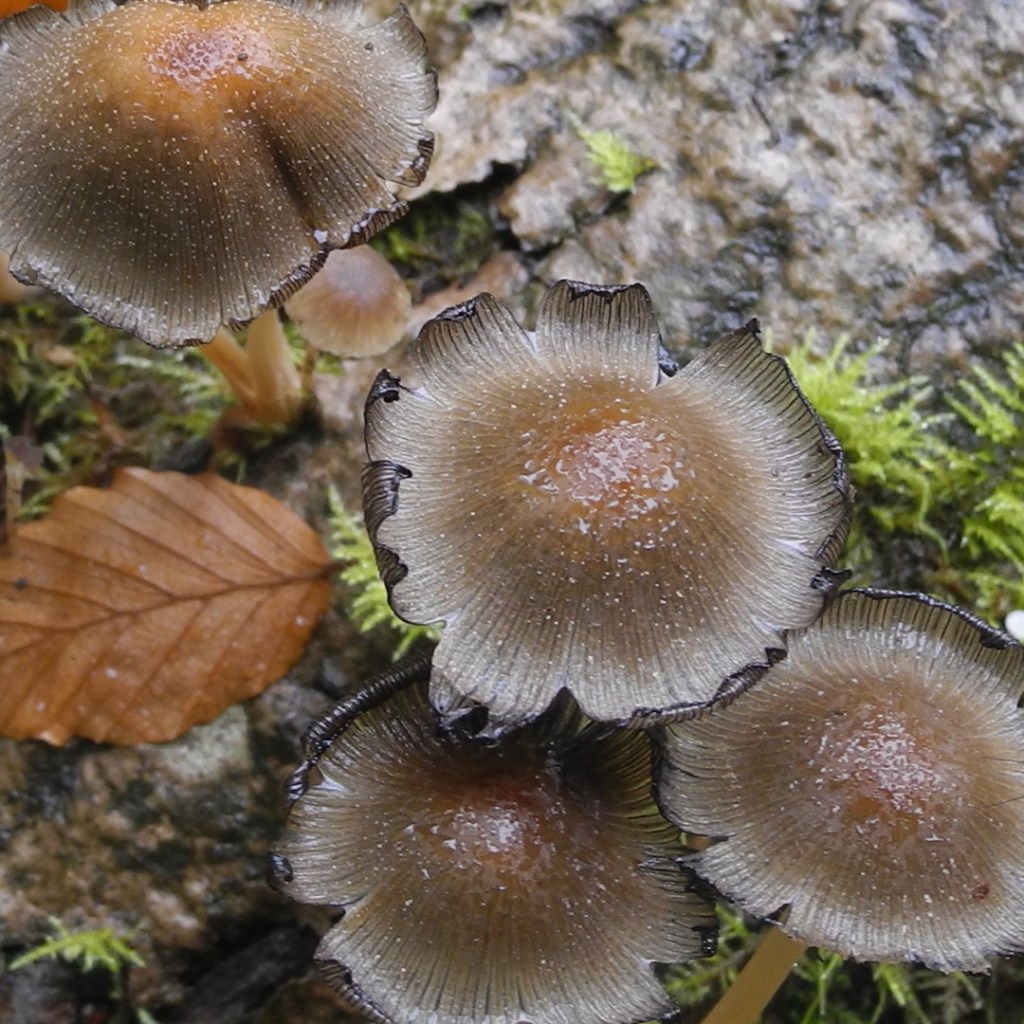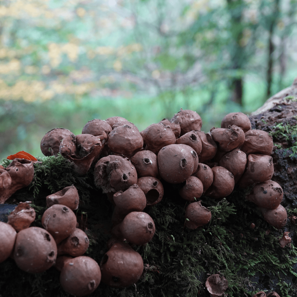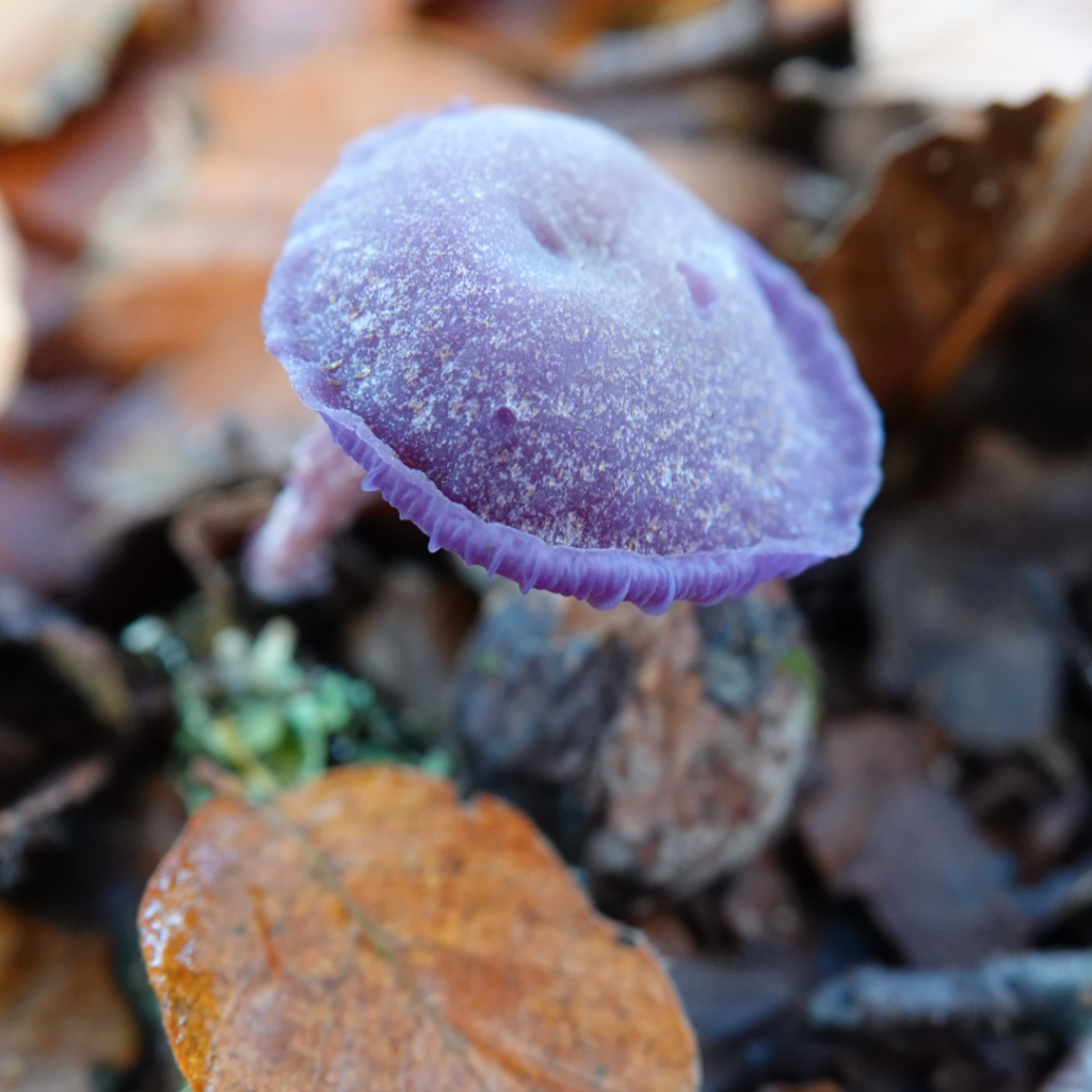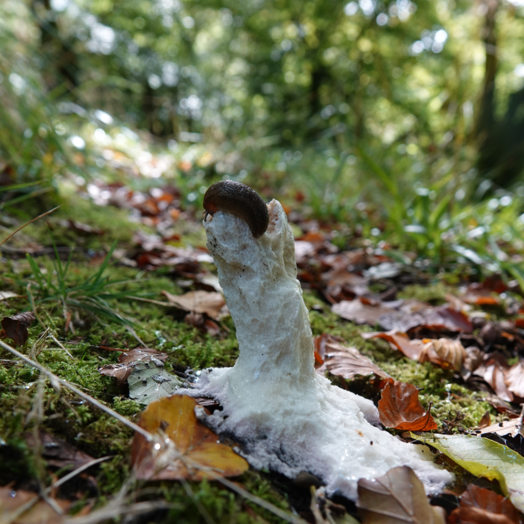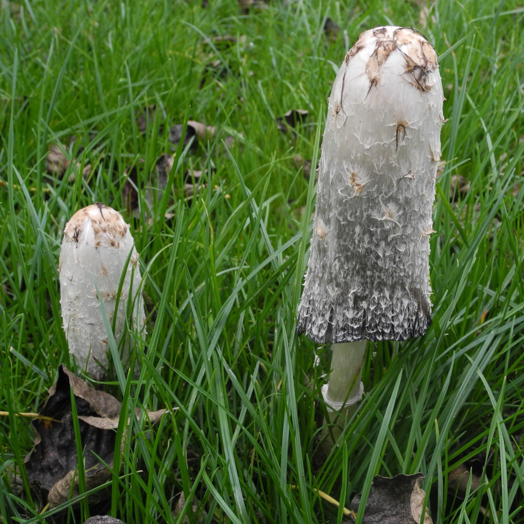 Shaggy Ink Cap also known as Lawyers WigPuffballsPorcelain Fungus Hedgehog FungusStagshornBirch PolyporeBracket FungiSulphur TuftSlug devouring a fungusOrange PeelElf CupBrown MushroomsThe underside of a gilled mushroomCandle SnuffHare’s EarsTurkeytailAmethyst Deceiver